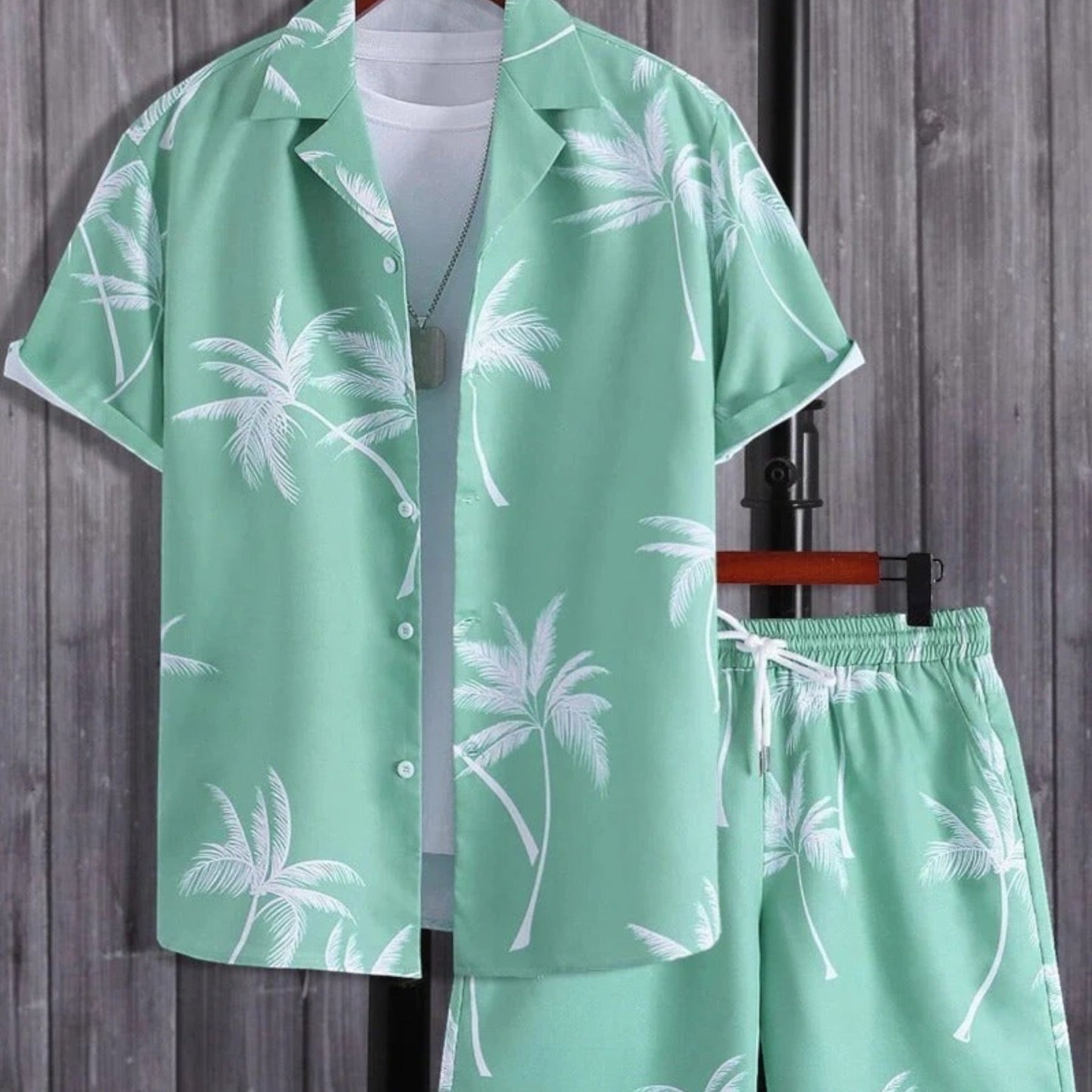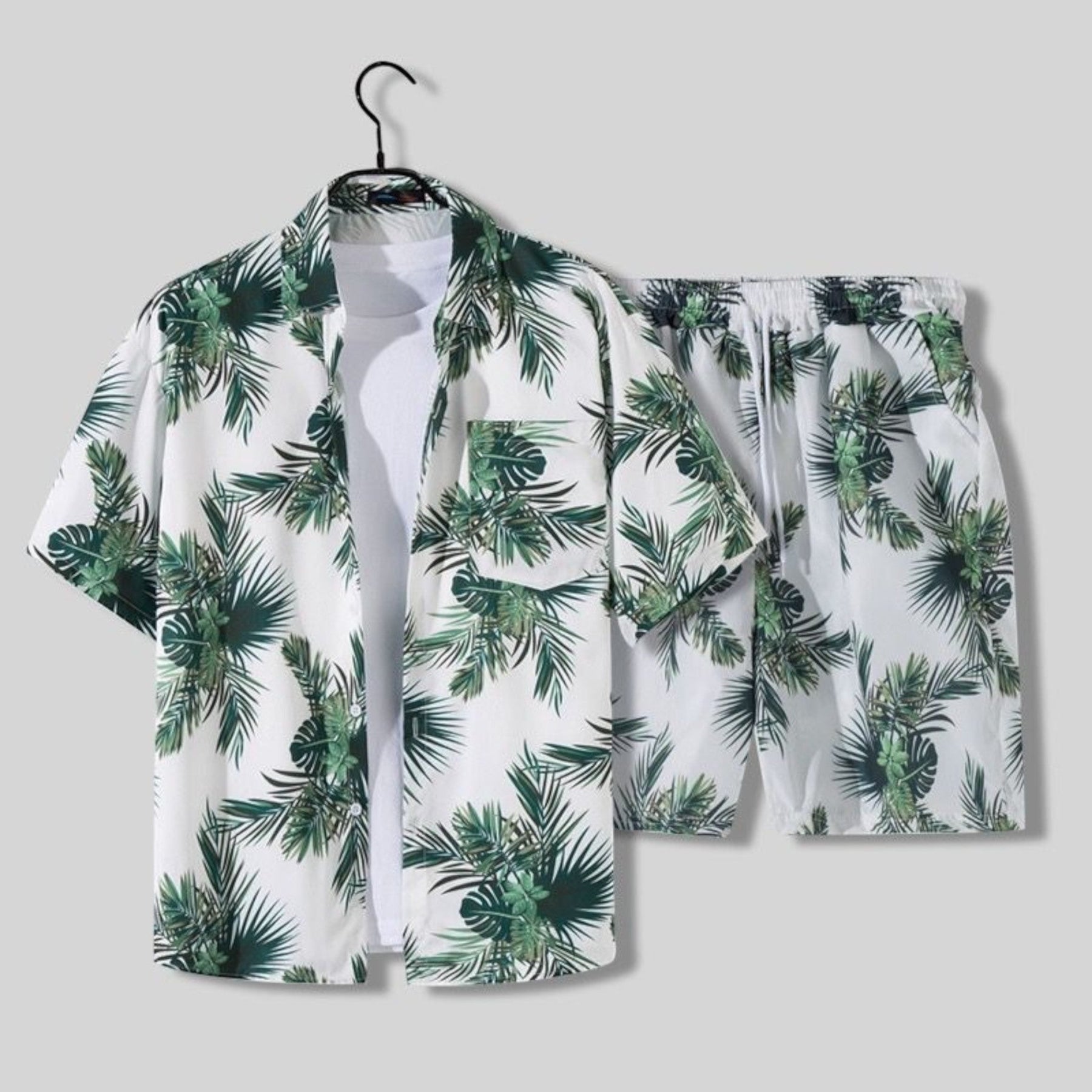 Experience the ultimate summer vibes with the Archie 2-part summer set for men. This airy and stylish ensemble, featuring a tropical shirt and matching shorts, is perfect for sunny days at the beach or a relaxed stroll through the city. The playful palm tree and feather pattern instantly transports you to a holiday atmosphere.