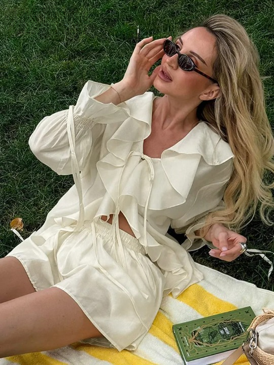 Experience effortless elegance with the Summer Breeze Shorts Set. This chic ensemble features a long sleeve design with ruffle details and a stylish lace-up front, crafted from lightweight chiffon. Perfect for casual outings or summer holidays, this set combines comfort and sophistication, making it a must-have addition to your wardrobe.